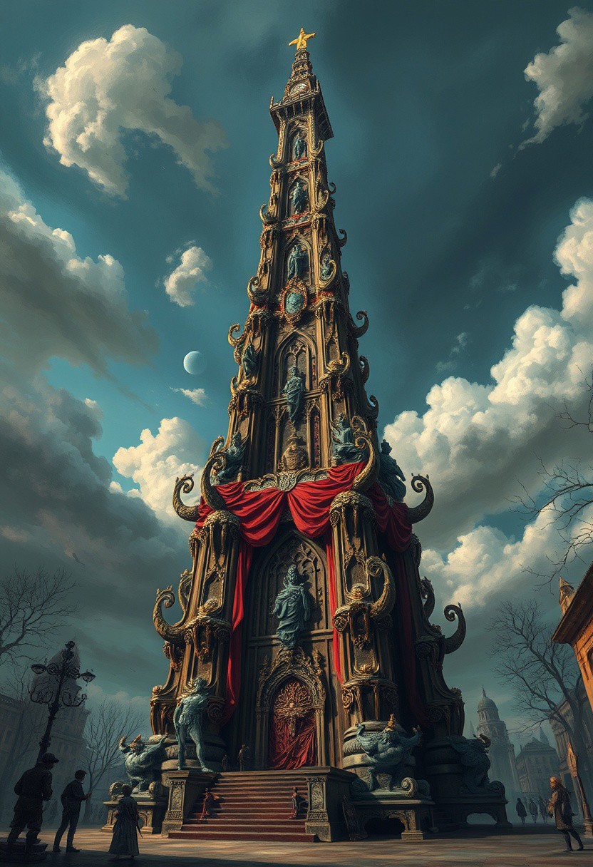 Stood a towering structure, cold and precise ,surreal street art, theatrical composition, bold colors, dreamlike realism, intricate detailing, whimsical yet eerie atmosphere, symbolic storytelling, vibrant contrasts, expressive characters, ornate decoration, fantastical elements, psychological depth, baroque influences, grotesque surrealism, dynamic movement