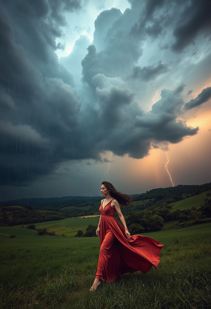 Una escena impresionante de una tormenta majestuosa donde múltiples arcoíris bien definidos se entrelazan entre las nubes oscuras y relámpagos iluminan el cielo con destellos místicos. La lluvia cae suavemente, reflejando los colores vibrantes del arco iris en cada gota. En el primer plano, una mujer elegante camina con gracia a través de un extenso valle verde, con el viento ondeando su vestido largo y fluido de seda. Su postura es imponente y llena de confianza, con una mirada serena y penetrante. Su cabello oscuro y ondulado flota con la brisa, capturando la esencia del momento. Cada detalle es nítido y bien definido, desde la textura del vestido hasta la suavidad de su piel. La iluminación cinematográfica realza los contrastes entre la tormenta y los colores vivos, aportando una profundidad asombrosa a la imagen. Capturado con una estética fotográfica en 4K ultra-realista, con una composición perfecta donde la mujer y la tormenta de arcoíris crean una armonía visual espectacular.