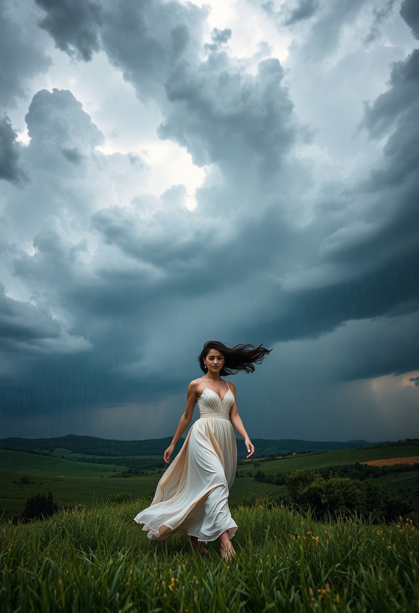 Una escena impresionante de una tormenta majestuosa donde múltiples arcoíris bien definidos se entrelazan entre las nubes oscuras y relámpagos iluminan el cielo con destellos místicos. La lluvia cae suavemente, reflejando los colores vibrantes del arco iris en cada gota. En el primer plano, una mujer elegante camina con gracia a través de un extenso valle verde, con el viento ondeando su vestido largo y fluido de seda. Su postura es imponente y llena de confianza, con una mirada serena y penetrante. Su cabello oscuro y ondulado flota con la brisa, capturando la esencia del momento. Cada detalle es nítido y bien definido, desde la textura del vestido hasta la suavidad de su piel. La iluminación cinematográfica realza los contrastes entre la tormenta y los colores vivos, aportando una profundidad asombrosa a la imagen. Capturado con una estética fotográfica en 4K ultra-realista, con una composición perfecta donde la mujer y la tormenta de arcoíris crean una armonía visual espectacular.
