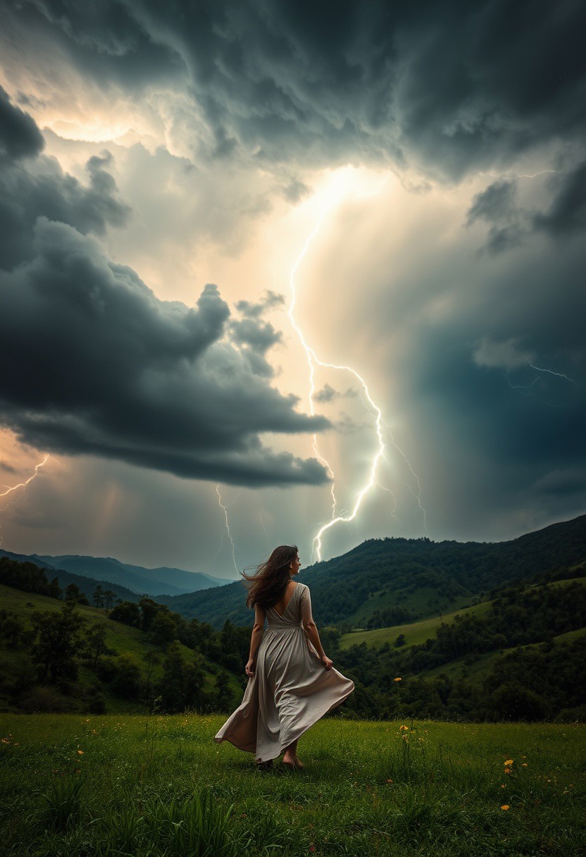 Una escena impresionante de una tormenta majestuosa donde múltiples arcoíris bien definidos se entrelazan entre las nubes oscuras y relámpagos iluminan el cielo con destellos místicos., detallados los arco irirs. La lluvia cae suavemente, reflejando los colores vibrantes del arco iris en cada gota. En el primer plano, una mujer elegante camina con gracia a través de un extenso valle verde, con el viento ondeando su vestido largo y fluido de seda. Su postura es imponente y llena de confianza, con una mirada serena y penetrante. Su cabello oscuro y ondulado flota con la brisa, capturando la esencia del momento. Cada detalle es nítido y bien definido, desde la textura del vestido hasta la suavidad de su piel. La iluminación cinematográfica realza los contrastes entre la tormenta y los colores vivos, aportando una profundidad asombrosa a la imagen. Capturado con una estética fotográfica en 4K ultra-realista, con una composición perfecta donde la mujer y la tormenta de arcoíris crean una armonía visual espectacular.