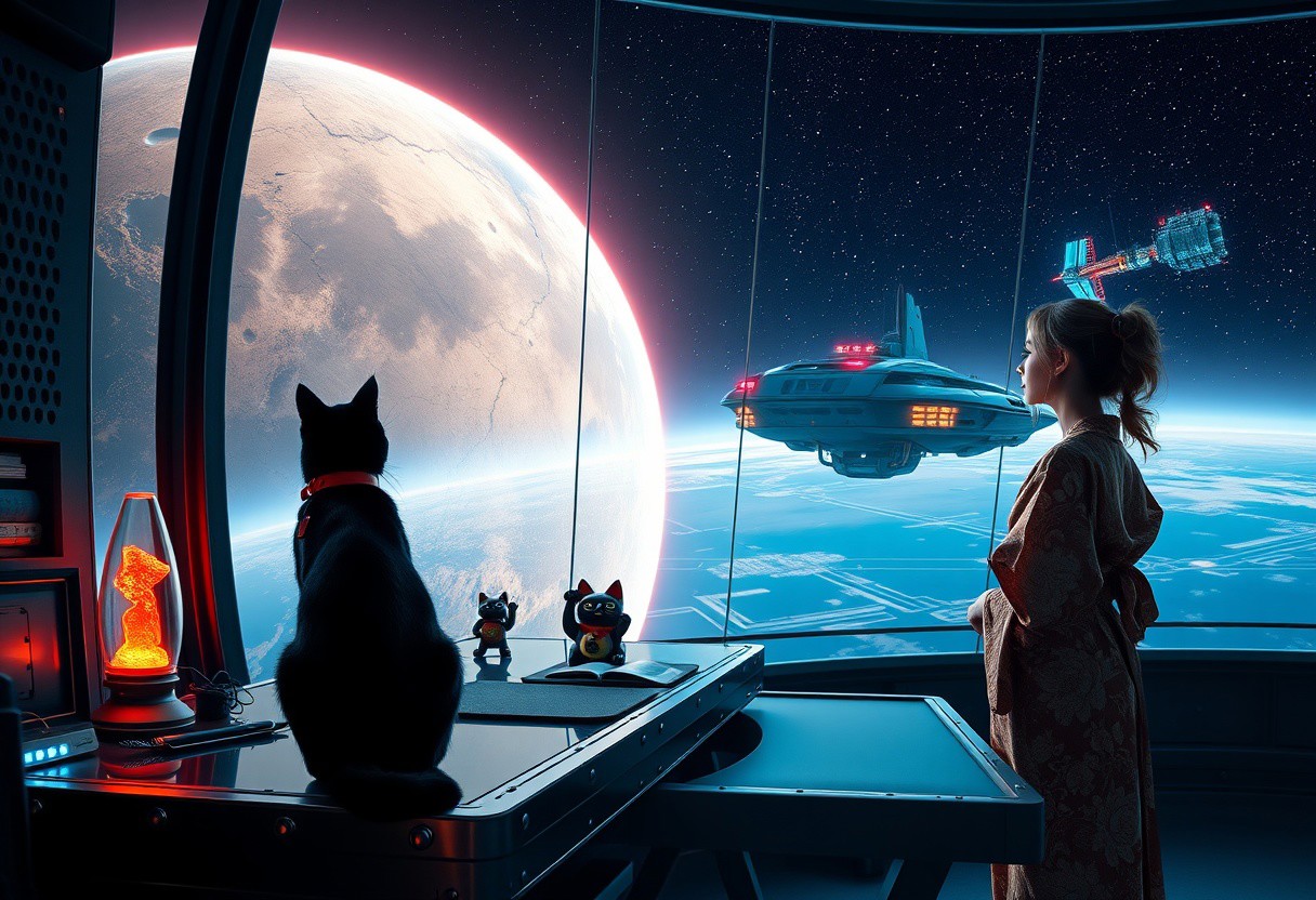 A sleek black cat with red collar sits on a cluttered metal riveted desk with transparent top and rgb led computer components visible inside, On the desk are a maneki neko statue and a lava lamp, the Black Cat is looking out of a seamless and futuristic floor to ceiling window that looks out at a planet from low orbit, (((a beautiful woman, 24 years old, is standing next to the cat looking out the window, the woman is dressed in an ornate Japanese style bath robe. An enormous deco-cyberpunk starship with futuristic lighting and an enormous space station are visible in the background among the stars, The woman's hair is messy from just waking up and tied up with a ribbon. Artistic cyberpunk, dynamic perspective, (((overall architectural aesthetic is Art Deco Cyberpunk))). Epic image that elicits a feeling of wonder and awe,