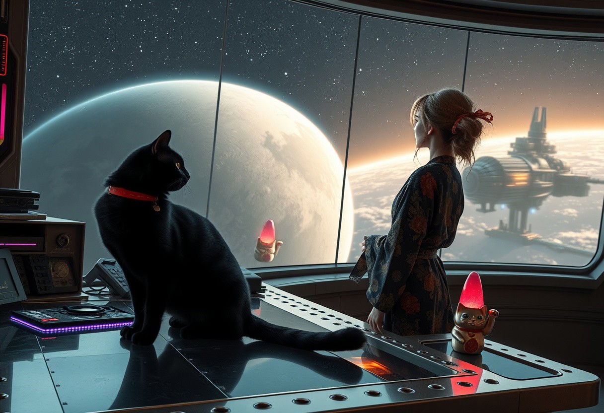 A sleek black cat with red collar sits on a cluttered metal riveted desk with transparent top and rgb led computer components visible inside, On the desk are a maneki neko statue and a lava lamp, the Black Cat is looking out of a seamless and futuristic floor to ceiling window that looks out at a planet from low orbit, (((a beautiful woman, 24 years old, is standing next to the cat looking out the window, the woman is dressed in an ornate Japanese style bath robe. An enormous deco-cyberpunk starship with futuristic lighting and an enormous space station are visible in the background among the stars, The woman's hair is messy from just waking up and tied up with a ribbon. Artistic cyberpunk, dynamic perspective, (((overall architectural aesthetic is Art Deco Cyberpunk))). Epic image that elicits a feeling of wonder and awe,