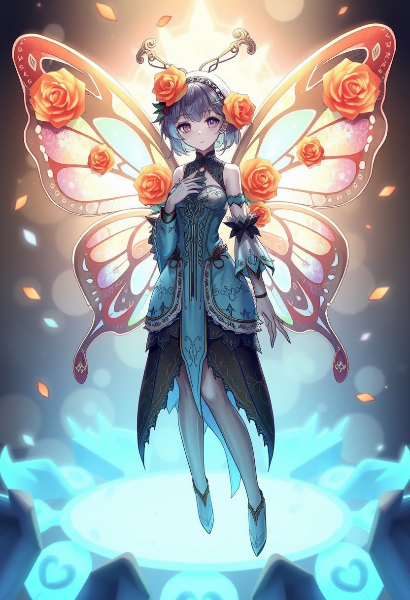 bo-an1me, a fantasy character with butterfly wings adorned with orange roses, wearing an ornate outfit<lora:boFLUX Anime Abyss.safetensors:1.0:1.0>