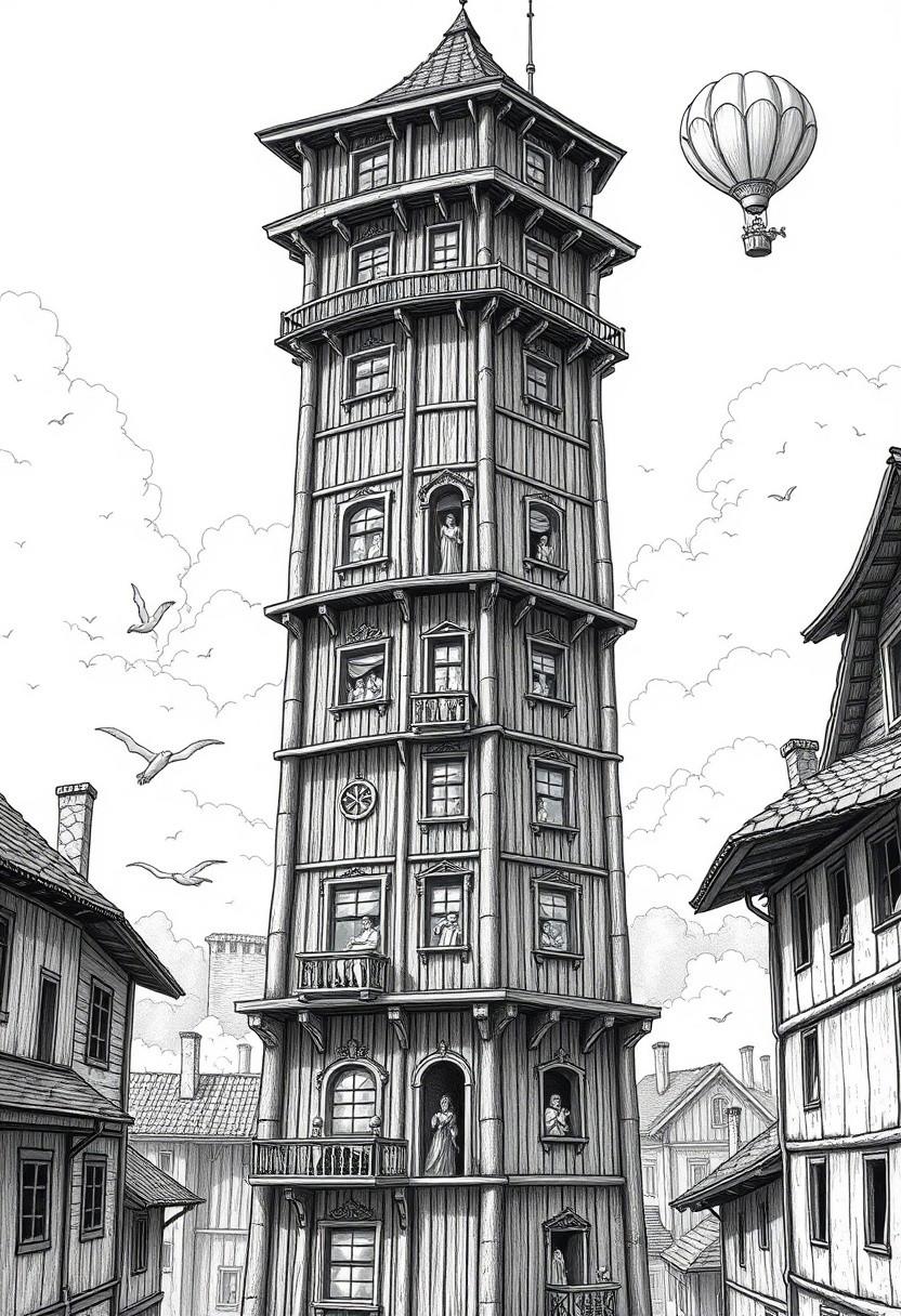 An infinitely tall middle ages wooden skyscraper narrow with overhangs to the upper stories and steeply pitched roofs, ramshackle, the atmosphere is bright sunlit and sharp and clear, with many finely detailed scenes seen through windows in the tower, elaborately dressed prostitutes are soliciting from balconies on the tower, Leonardo da Vinci is taking off from the highest roof in his flying in his primitive hot air balloon, black and white line drawing
