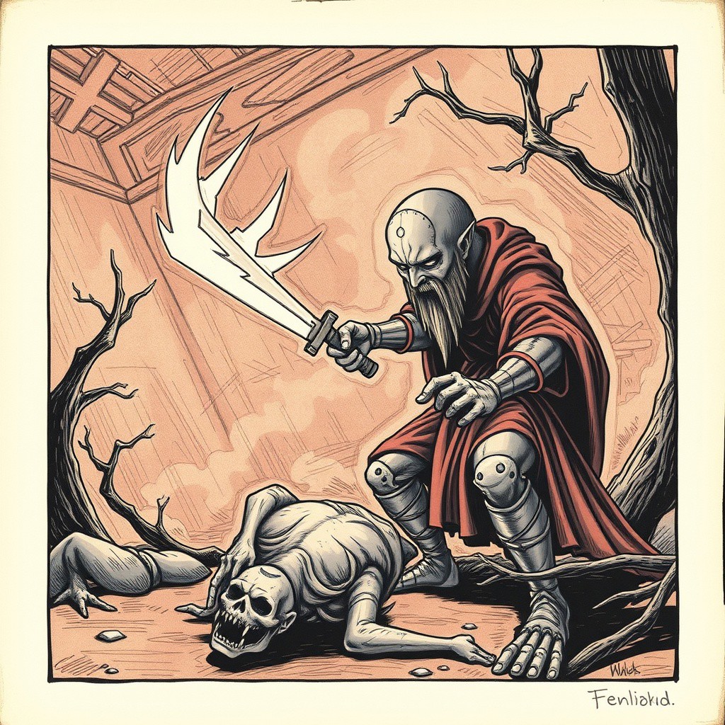 One, two! One, two! And through and through The vorpal blade went snicker-snack! He left it dead, and with its head He went galumphing back.