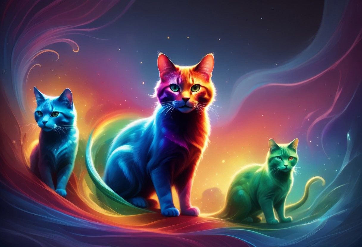 An intricate, vibrant illustration of a massive crowd of cats, filling the frame with no visible background, reimagined with a **flowing rainbow motif**. Each cat is stylized with prismatic accents, shimmering gradients, and fluid forms, showcasing a variety of breeds in surreal designs. The color palette bursts with vivid hues: radiant reds, oranges, yellows, greens, blues, indigos, and violets, blending seamlessly. Cats are arranged densely, their forms distinct yet interconnected, glowing with iridescent fur and trailing ribbons of light. Some have galaxy-like patterns, while others shimmer with shifting gradients. Their eyes sparkle with multicolored reflections, and tails flow like liquid light. Flowing rainbow elements—arcs of light, prismatic halos, and shimmering trails—weave through the scene, creating movement. The background is a gradient of twilight purples and midnight blues, evoking a dreamlike cosmic sky. The hyper-detailed, surreal style combines rainbow vibrancy with fantastical elements, infusing the scene with wonder, joy, and boundless creativity.