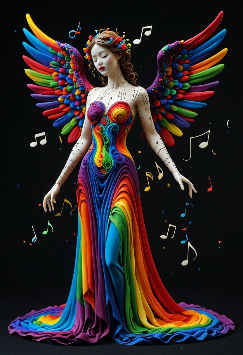 surreal , high contrast , Rainbow Morph ,symphony concept , abstract , abnormal ,absurd , musical theme , musical note , music sheet circles , abnormal face, (music note face ) , majestic , ending , full body, masterpiece, best quality ,amazing quality , angel singer, long dress made of universe, music Morph 15546+456868, usnr ,