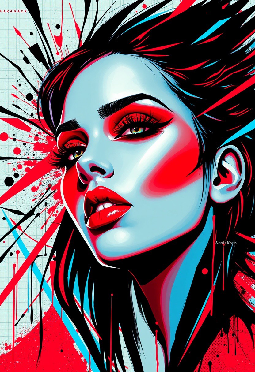 This is a highly stylized digital artwork of a woman's face. The piece uses vibrant colors, primarily reds and blues, with black accents to create a striking contrast. The makeup, especially the eyeshadow and lipstick, are bold and exaggerated, contributing to a dramatic effect. The background features abstract lines and shapes that give an impression of movement or disarray. This chaotic backdrop contrasts sharply with the woman's serene expression. The image has a modern, almost cyberpunk aesthetic due to its use of sharp angles, neon-like hues, and digital effects such as grid patterns and drips. Overall, the composition conveys intensity and emotion through its dynamic visual elements.