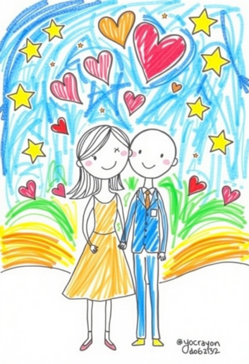 This is a colorful, whimsical drawing depicting a drawing of a happy couple, stars and hearts in the background. <lora:5yocrayon1_cap_d6a3e12:1.0><lora:822103212283676683:0>