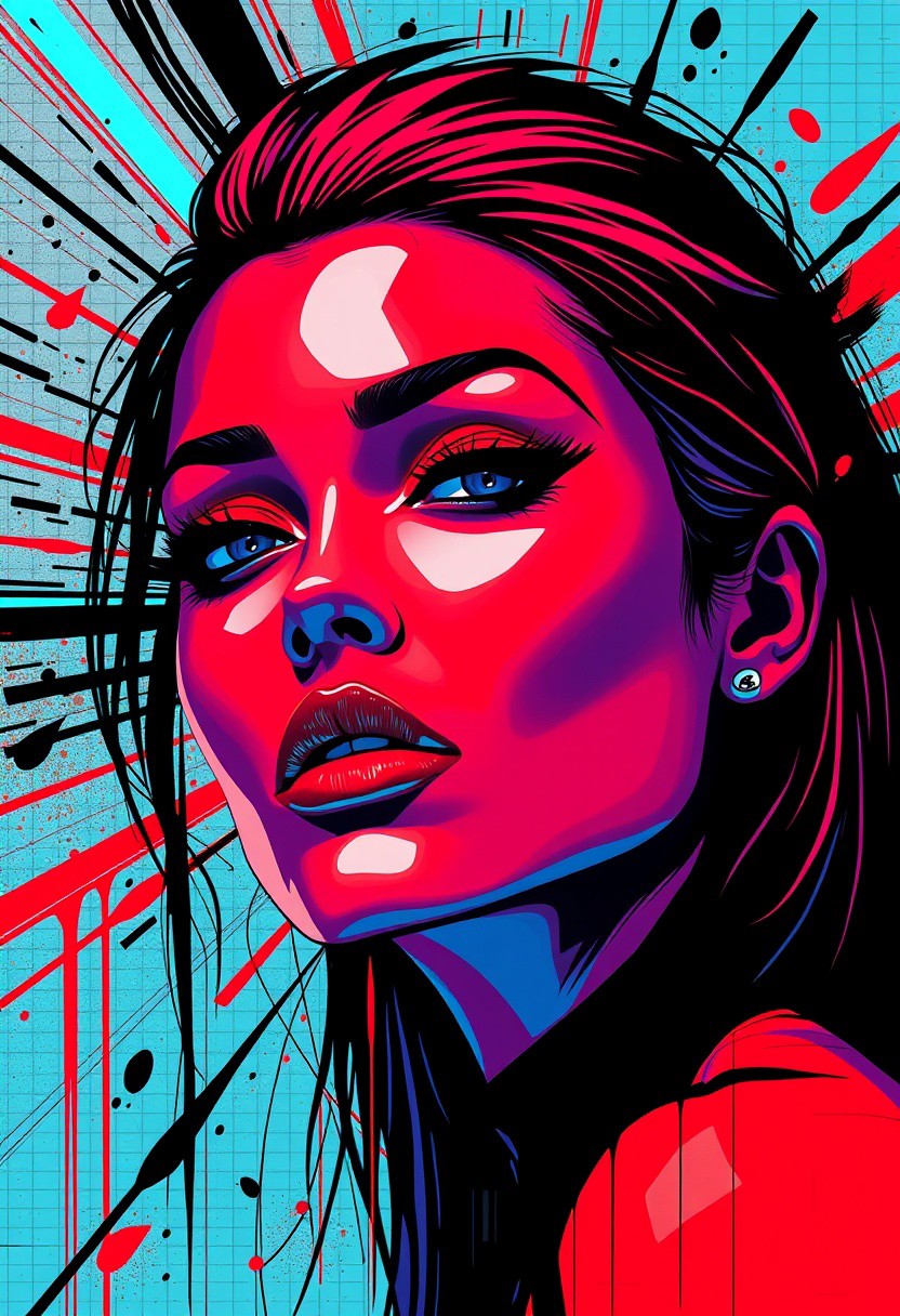 This is a highly stylized digital artwork of a woman's face. The piece uses vibrant colors, primarily reds and blues, with black accents to create a striking contrast. The makeup, especially the eyeshadow and lipstick, are bold and exaggerated, contributing to a dramatic effect. The background features abstract lines and shapes that give an impression of movement or disarray. This chaotic backdrop contrasts sharply with the woman's serene expression. The image has a modern, almost cyberpunk aesthetic due to its use of sharp angles, neon-like hues, and digital effects such as grid patterns and drips. Overall, the composition conveys intensity and emotion through its dynamic visual elements.