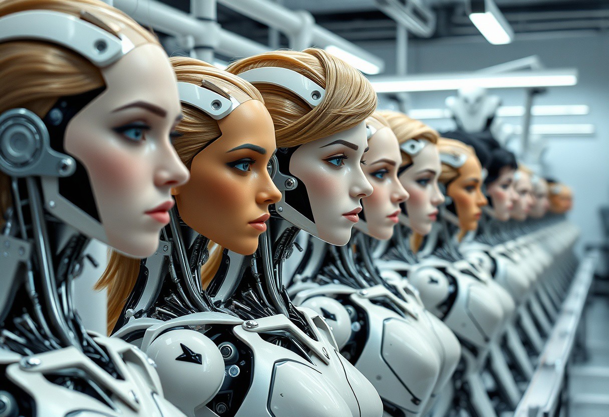Wide shot of a production line of beautiful female cyborgs. They all have different heads, skin and hair colors. The workshop is white and aseptic, with high-tech machinery. The image is highly detailed and high-definition.