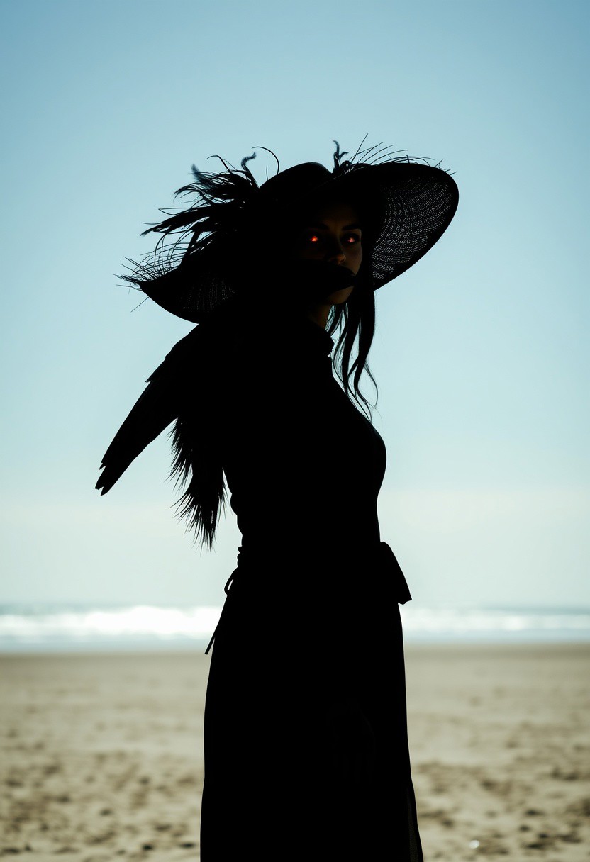 black silhouette of an woman whose eyes are eerily glowing, a raven on her shoulder, black big hat, beach, day light, full body, long shot,