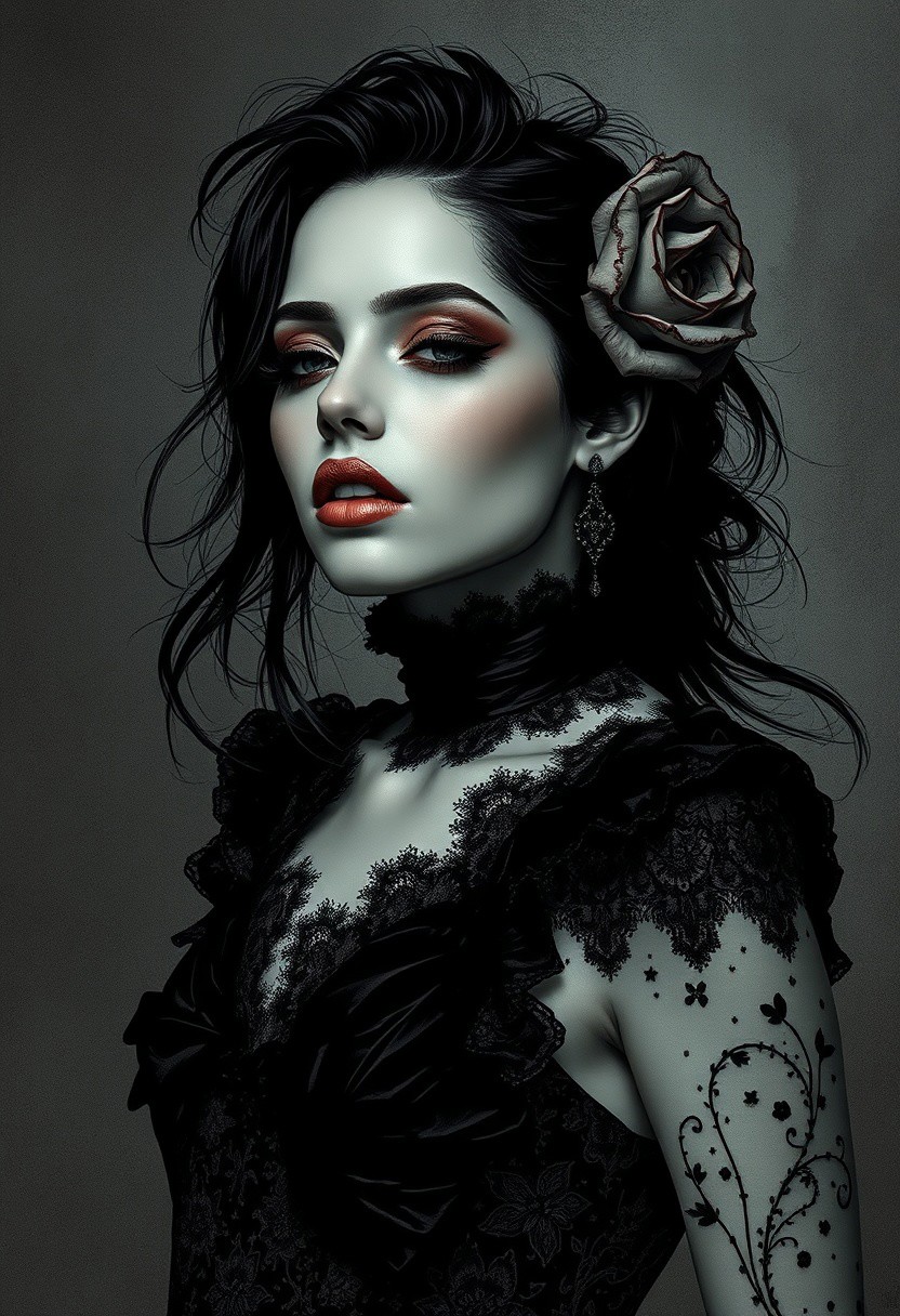 The sweet, wild ways with stainless bloom inwrought,, avant-garde aesthetics, dark elegance, graphic novel influence, high-contrast compositions, moody and atmospheric lighting, intricate linework, fashion-forward styling, surreal storytelling, edgy minimalism, gothic futurism, bold silhouettes, expressive textures, dynamic movement, emotionally intense themes, refined yet rebellious aesthetic