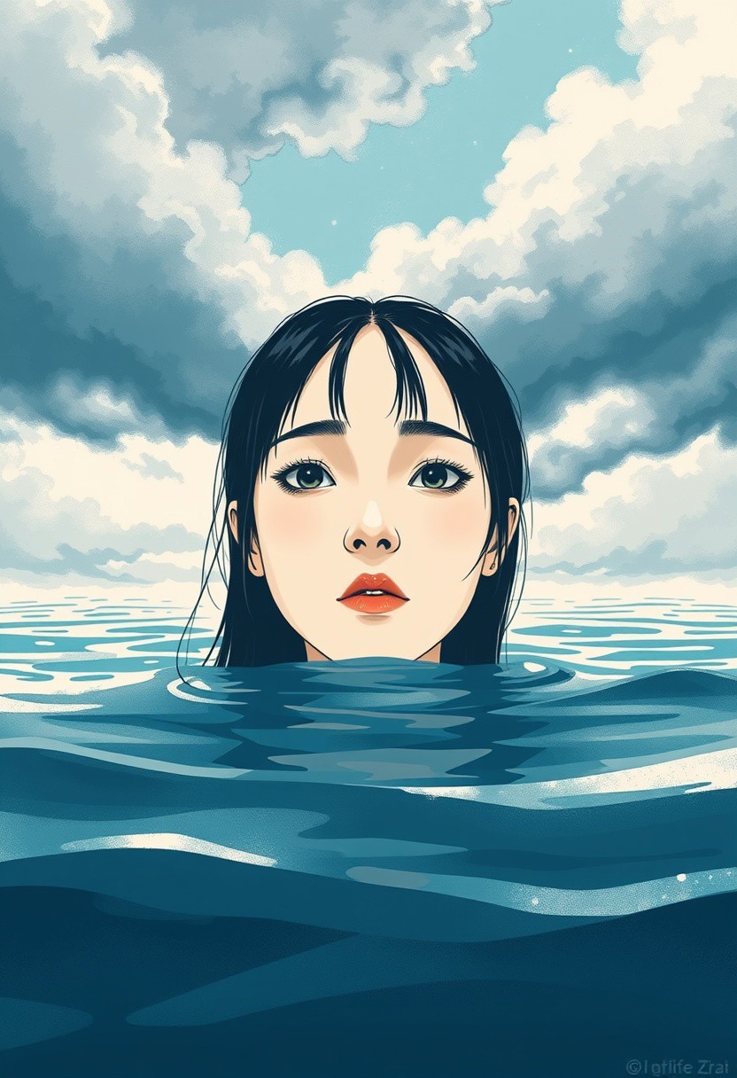 O! none, unless this miracle have might,, modern Japanese illustration style, water under dark clouds, minimal design, serene composition, expressive brushstrokes, close-up portrait, bold colors, high contrast chiaroscuro lighting, negative colors, vibrant composition, white and sky blue tones, bright and overexposed effect, dramatic atmosphere, artistic simplicity, striking visual impact