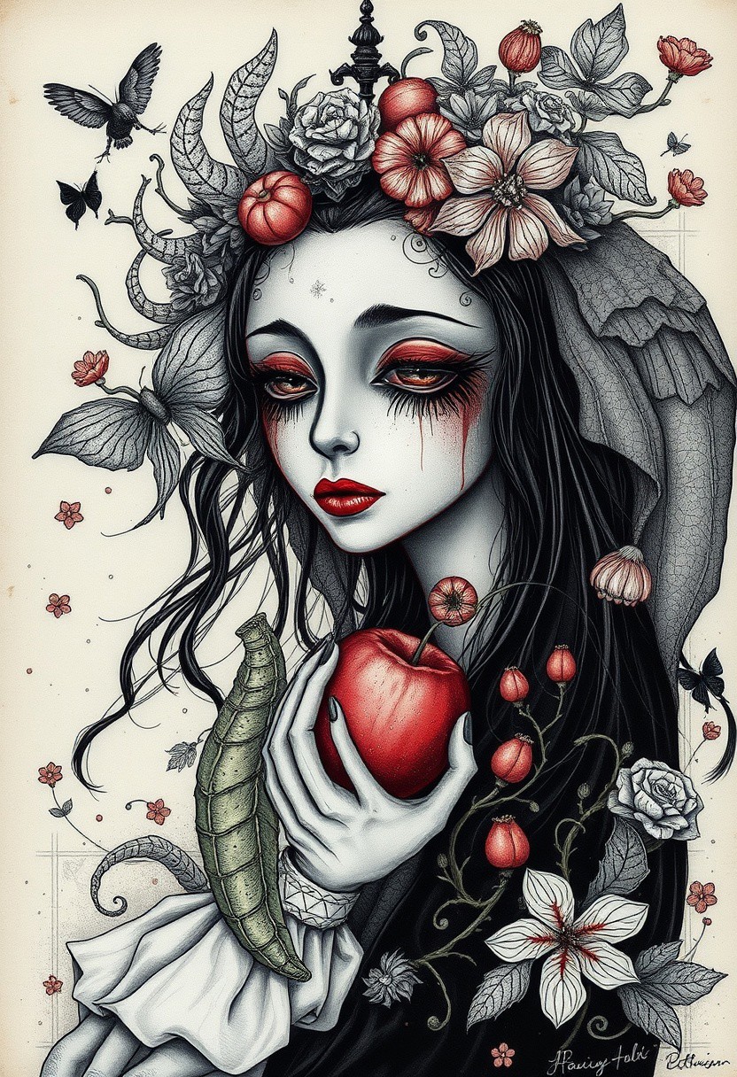 Are the Fruits of the Two seasons, mystical surrealism, intricate linework, bold contrasts, dreamlike storytelling, spiritual symbolism, delicate yet powerful, monochrome and vibrant palettes, fine details, expressive figures, whimsical gothic, contemporary folk art, mythical creatures, emotionally charged composition, ethereal atmospheres, narrative depth