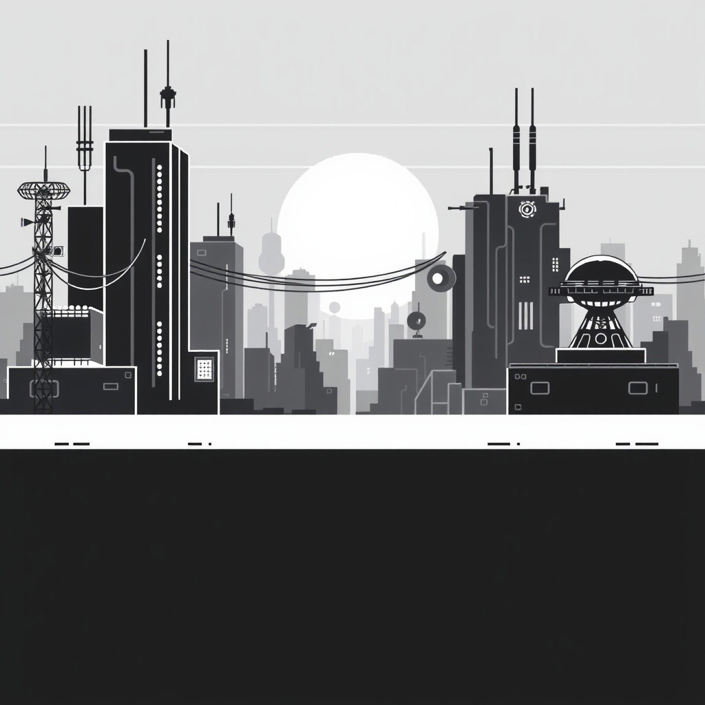 Monochrome pixel art high-tech background, inspired by the Chrome Dino game. Minimalist 8-bit style with clean, black-and-white design. Elevated flat ground with a futuristic, sci-fi cityscape in the background. Blocky skyscrapers, antennas, glowing panels, and cables stretching between buildings. Distant satellite dishes and robotic structures. Ground remains simple with a smooth, slightly elevated surface, maintaining the original Dino game's aesthetic. Low resolution, simple shading, clean outlines, retro side-scrolling platformer style.