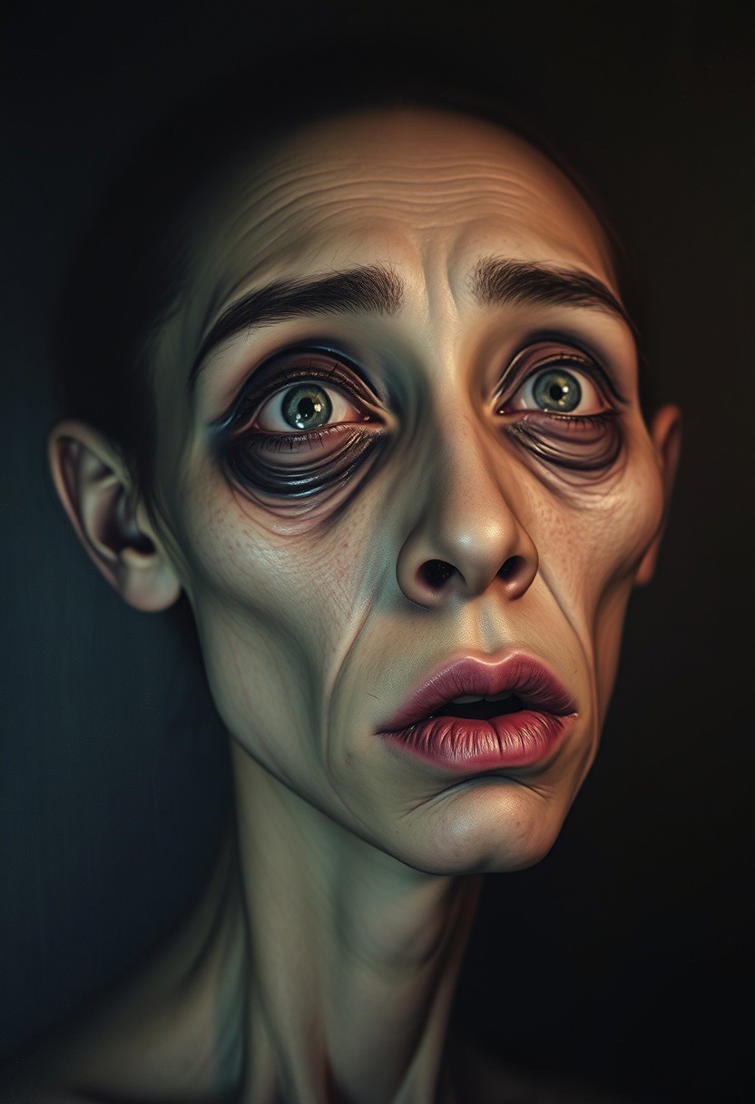 An eerie self-portrait, blending Abercrombie's surrealism and Fang's emotional distortion, shows a face that is both serenely eerie and grotesquely exaggerated.