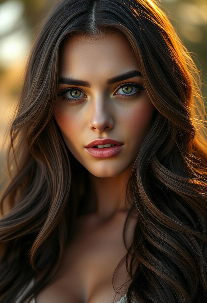A stunning beautiful woman with ((piercing sapphire eyes)), porcelain skin, and (Full very plump velvet lips), her Brown Pastel luscious hair cascading down around her torso in loose effortless waves. Soft golden natural light wraps around her, casting a warm glow on her skin, while a shallow depth of field and creamy bokeh blur the background, drawing the viewer's gaze to her serene alluring presence. Captured with a telephoto lens on a 64-megapixel DSLR Canon, the image exudes a sense of intimacy and quiet confidence, with sharp focus on the subject's face and subtle, nuanced expressions, evoking the works of professional photographers like Annie Leibovitz, Mario Testino, and Paolo Roversi. (Photorealism, Ultra-Realism), (epic), (masterpiece), trending on Artstation, golden ratio, 32k UHD, HDR,