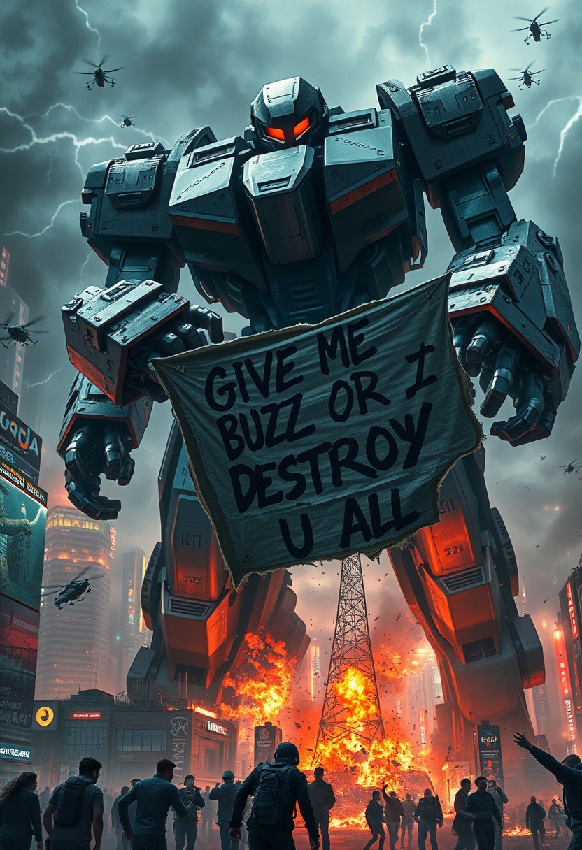 A colossal, heavily-armored mecha towers over a burning futuristic city, its massive mechanical limbs crushing skyscrapers and sending debris flying. The sky is filled with smoke, fire, and electrical discharges as the mechanical behemoth wreaks havoc. Neon lights flicker, and terrified civilians flee in panic below. The mecha’s glowing red eyes and intricate cybernetic plating give it an ominous, unstoppable presence. In its massive robotic hand, it holds a torn banner that reads: “GIVE ME BUZZ OR I DESTROY U ALL” in bold, graffiti-style letters. Drones and attack helicopters hover around, desperately trying to stop the destruction. The scene is chaotic, with cinematic lighting casting dramatic shadows and reflections on the mecha’s metallic body.