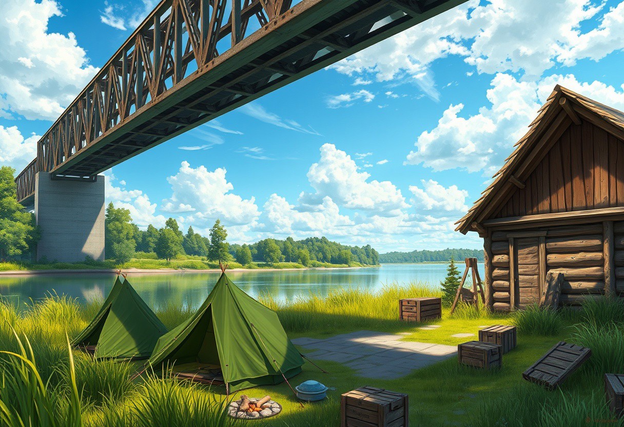 A vibrant, detailed digital painting captures a peaceful outdoor scene. A massive, industrial steel truss bridge stretches across the middle, supported by hefty concrete pillars. Below, a chill river mirrors the bright blue sky and fluffy clouds above. The riverbank is lush with tall, green grasses and trees, adding to the natural vibe. Up front, there's a campsite with several military-style green tents, showing off a rugged outdoor life. To the right, a wooden structure, maybe a small cabin or shelter, is built with logs and has a thatched roof. Scattered around are wooden crates, camping gear, and a small fire pit, hinting at a recent campfire. The lighting is bright and sunny, casting soft shadows and making the greens pop. The camera angle is straight-on, giving a clear view of the scene, with a slight tilt upwards to show off the bridge and sky. The whole scene screams tranquility and adventure.