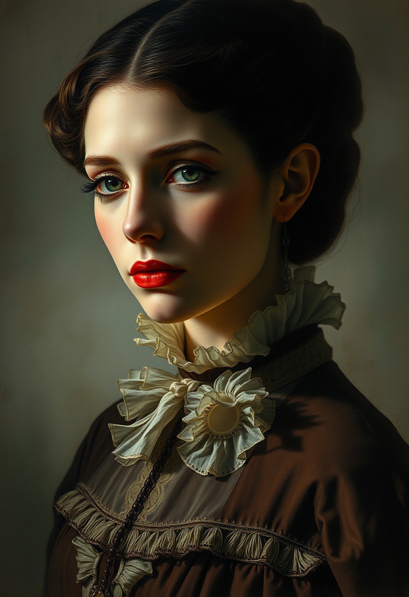 A meticulously painted woman in Victorian attire, her face illuminated with chiaroscuro lighting, but her shadow dissolving into soft, ghostly textures. classical symbolist realism, soft dreamlike atmosphere, muted antique color palette, surreal yet nostalgic storytelling, rich oil-painted textures, ethereal lighting, mysterious and poetic composition, timeless and haunting mood