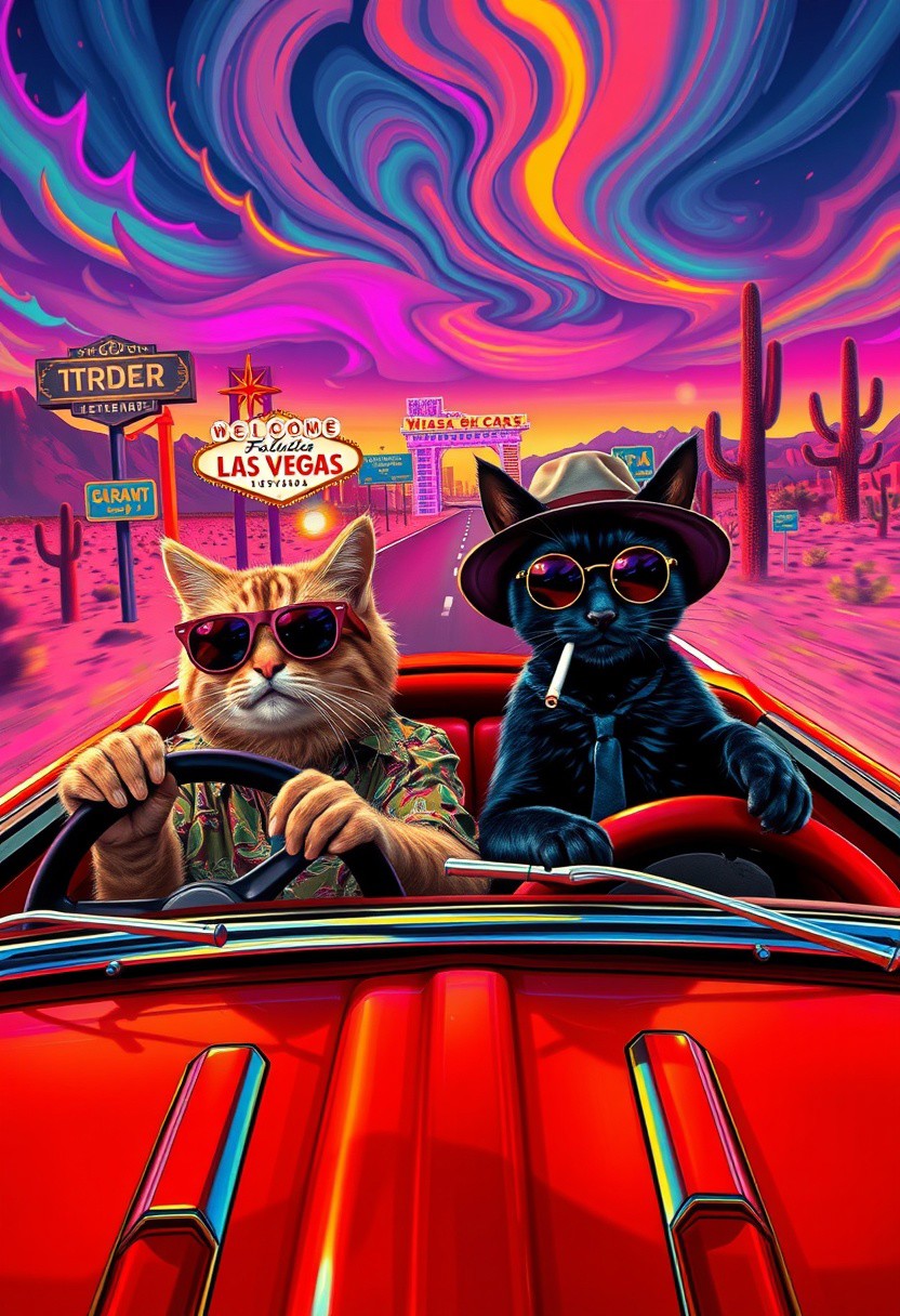 Two cats ride in a red convertible speeding down a desert highway toward a neon-lit Las Vegas skyline. The scene mirrors the iconic ‘Fear and Loathing in Las Vegas’ shot, but with feline travelers. The driver, a scruffy tabby in oversized aviator sunglasses and a Hawaiian shirt, grips the wheel with a wild expression. The passenger, a sleek black cat in a bucket hat and round tinted glasses, leans back with a smug grin, a cigarette dangling from its mouth. The environment is infused with psychedelic energy—distorted road signs melt into the horizon, the sky swirls with surreal colors, and cacti appear to sway and stretch. The desert landscape warps in a heatwave haze, while neon reflections shimmer in the car’s chrome details. The perspective is exaggerated and chaotic, capturing the frenetic, trippy atmosphere of the original scene in a humorous and feline twist.