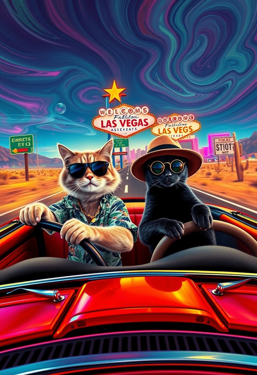 Two cats ride in a red convertible speeding down a desert highway toward a neon-lit Las Vegas skyline. The scene mirrors the iconic ‘Fear and Loathing in Las Vegas’ shot, but with feline travelers. The driver, a scruffy tabby in oversized aviator sunglasses and a Hawaiian shirt, grips the wheel with a wild expression. The passenger, a sleek black cat in a bucket hat and round tinted glasses, leans back with a smug grin, a cigarette dangling from its mouth. The environment is infused with psychedelic energy—distorted road signs melt into the horizon, the sky swirls with surreal colors, and cacti appear to sway and stretch. The desert landscape warps in a heatwave haze, while neon reflections shimmer in the car’s chrome details. The perspective is exaggerated and chaotic, capturing the frenetic, trippy atmosphere of the original scene in a humorous and feline twist.