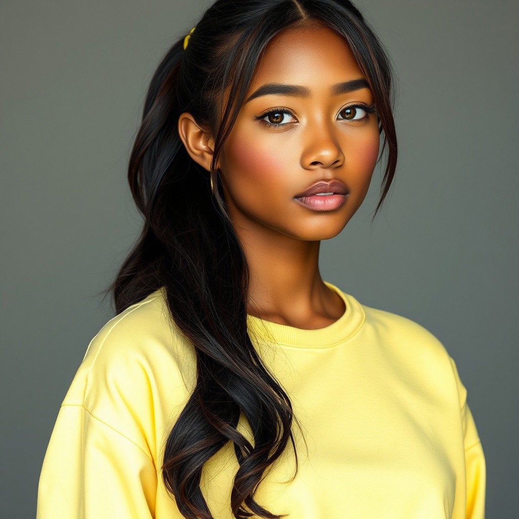 1girl, realistic, realistic photography, professional photography, photo from head to stomach, formal pose, facing the camera, head not out of frame, a 20 year old girl, light brown skin, height 165cm, chest circumference 73cm, lower chest circumference 63cm, round chest shape, stomach circumference 63cm, waist circumference 63cm, upper hip circumference 68cm, hip circumference 73cm, oval face, chin without slit, small ears, straight nose, bow shaped lips, almond shaped eyes, yellow eye color, thick straight eyebrows with a slight gentle curve, very long hair touching the hips, slightly wavy black slightly reddish hair, hair combed back, hair tied in a ponytail, only 1 ponytail, no front bangs, no side bangs, no bangs, yellow hair tie, wearing a long sleeved cotton t-shirt without buttons with an o neck collar, t-shirt covering up to the ankles, light yellow t-shirt, wearing light yellow stilettos, no make-up face, wearing a pair of gold earrings, wearing a gold necklace, not wearing a ring, not wearing a bracelet, no blush on the nose, no blush on the cheeks, no blush on the face, white wall background, professional photo studio lighting, accurate anatomy, detailed anatomy, realistic anatomy, detailed skin texture, realistic skin texture, detailed skin pores, realistic skin pores, detailed face, realistic face,