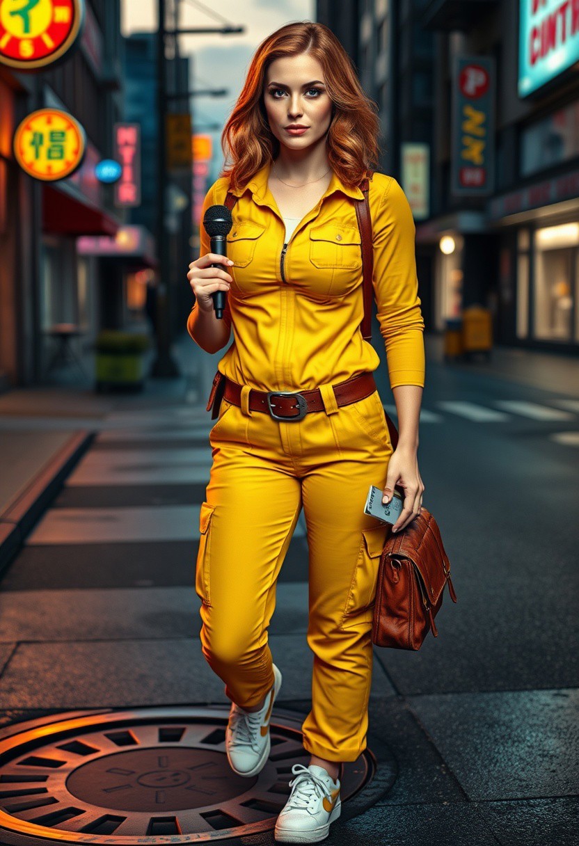 A photorealistic image of a woman resembling April O'Neil from * Mutant Ninja Turtles* as a real human. She has a strikingly beautiful, athletic figure with toned curves, huge breasts, a slim waist, and a confident stance. Her shoulder-length auburn hair is styled in soft waves, framing her face with bright, intelligent eyes and a warm, determined expression. She is wearing her signature yellow jumpsuit, perfectly fitted to her body, with the zipper slightly undone at the top for a casual yet professional look. The jumpsuit features utility pockets and a matching belt, emphasizing her practical and adventurous personality. She pairs this with white sneakers and a vintage brown leather shoulder bag slung across her torso, containing a notepad, a microphone, and other reporter essentials. The setting is an urban street at dusk, with the faint glow of neon signs reflecting off wet pavement. She is standing near a manhole cover, holding a handheld microphone in one hand and a notepad in the other, as if she's in the middle of investigating a story. The lighting is cinematic, with a mix of cool blues and warm orange hues highlighting her figure and creating a dramatic yet grounded atmosphere. The scene captures her intelligence, bravery, and charm, bringing the animated character to life in a realistic, modern context.