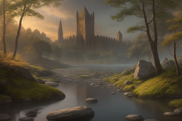 a breathtakingly surreal and vibrant oil painting depicting a turbulent serpentine river that winds its way through a green wooded valley, its crystal clear waters glistening in the soft, golden light of dawn, as if washing away the dark, ominous dreams of the night, while in the distance, a majestic, ancient tower rises, its stone walls weathered to a moss-covered grey, the overall scene infused with a sense of mystique and foreboding, as if the very fabric of reality is about to unfold,