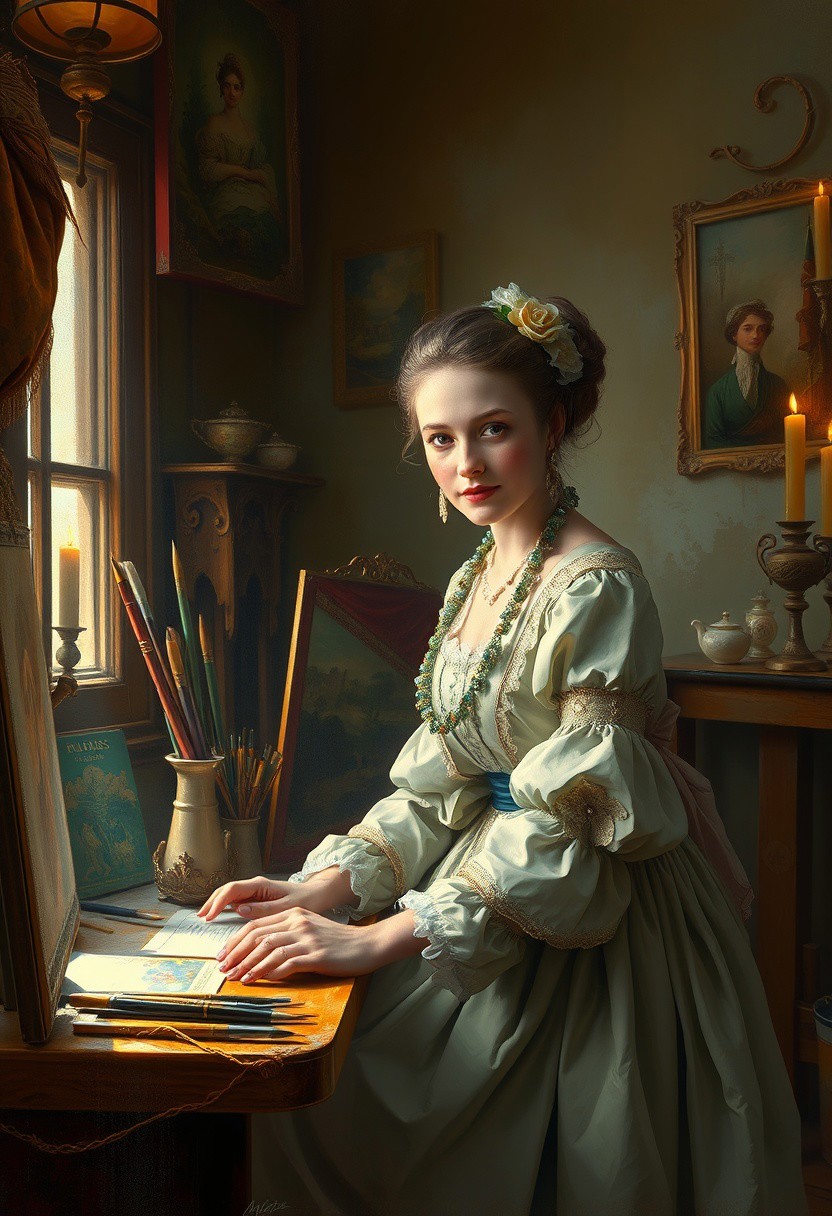 A dreamy, nostalgic moment in a quiet artist’s studio, where the play of light enhances the scene’s warmth, and every small detail—from the brushes to the sitter’s expression—feels alive with depth and personality. warm nostalgic realism, richly detailed genre scene, soft luminous portraiture, delicate aristocratic elegance, refined historical attire, painterly textures with impressionistic warmth, storytelling atmosphere, candlelit interiors or golden sunlight