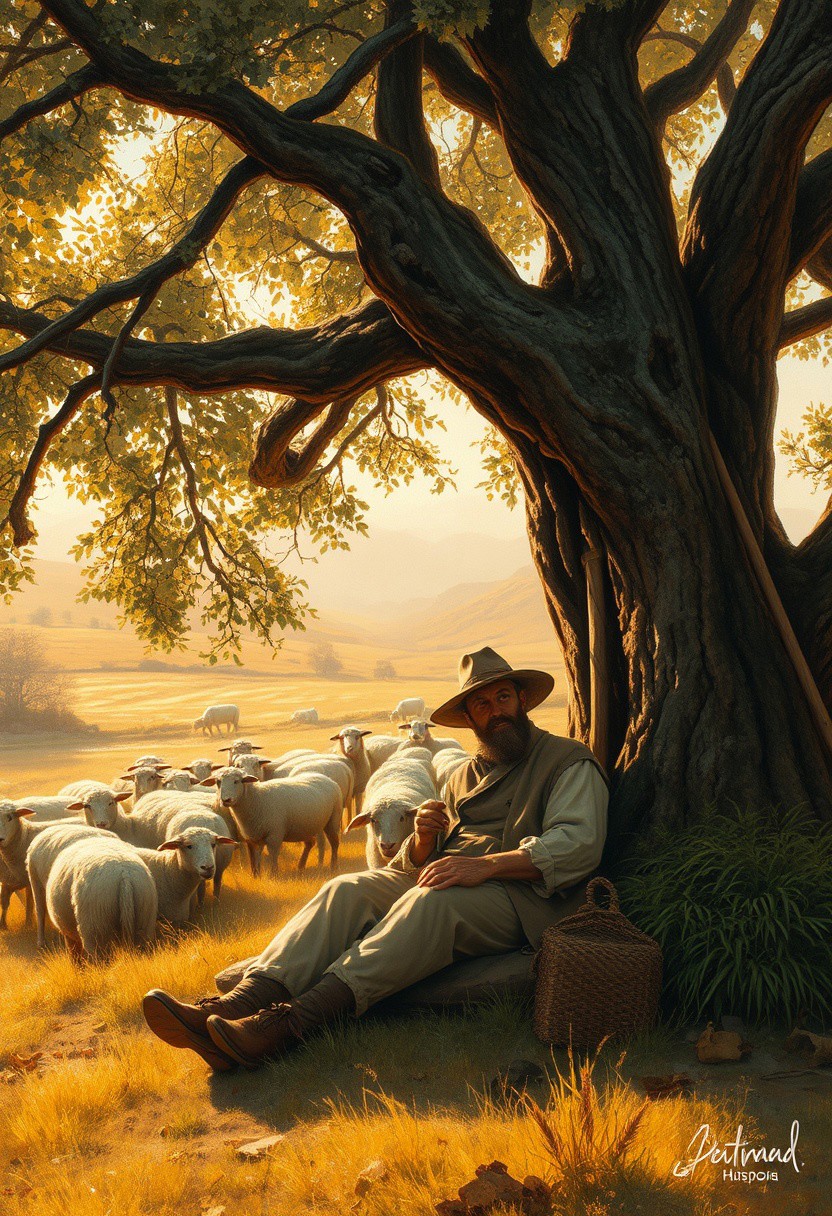 A shepherd resting under an old oak tree, with sheep grazing peacefully in the background, the golden light casting an ethereal, storybook-like atmosphere. richly detailed historical realism, expressive animal and human connection, warm golden light, soft idyllic countryside, painterly brushwork with delicate textures, romanticized yet highly detailed composition, dramatic yet harmonious atmosphere