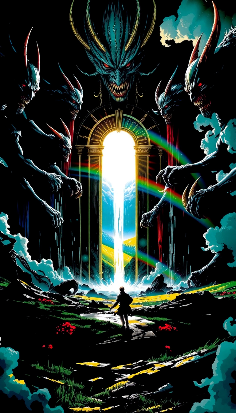 score_9, score_8_up, score_7_up, score_6_up, 8k, hd, master piece. A dimensional magic portal, set vertically, to a magical fairy land, with green fields and rainbows. On the front a very dark and full of demons scenario. Very wide shot. There's a person running to the portal as escaping from something. Mystic, abstract, fantasy, drkfnts style embedding:badhandv4.pt embedding:easynegative.safetensors nistyle, DGLO style.