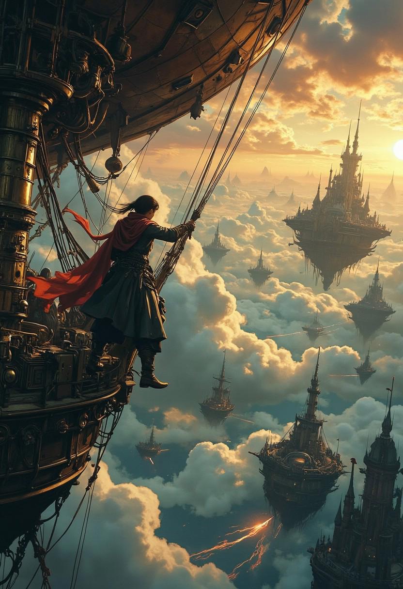 (Steampunk adventure, layered composition, detailed, strong depth) — A daring sky pirate clings to the rigging of a massive airship, her tattered scarf billowing toward the foreground. Below, a fleet of enemy ships soars between thick storm clouds, their brass-plated hulls gleaming under occasional flashes of lightning. In the background, an enormous floating city emerges from the haze, its towering spires silhouetted against the setting sun.