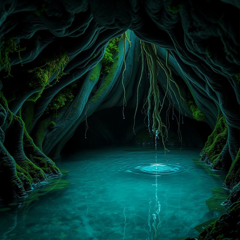 A hidden oasis beneath the massive roots of an ancient oak tree. A narrow crevice opens within the gnarled root system, revealing a secluded underground cavern. The space is softly illuminated by glowing bioluminescent moss and lichen clinging to the damp walls. Delicate, tangled roots hang from the ceiling, their tips dripping crystal-clear water like silent tears. The droplets fall into a pristine, mirror-like pool, its surface undisturbed and shimmering with an ethereal glow. The atmosphere is mystical, serene, and untouched by time.