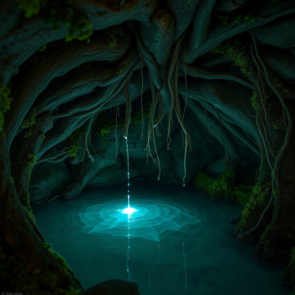 A hidden oasis beneath the massive roots of an ancient oak tree. A narrow crevice opens within the gnarled root system, revealing a secluded underground cavern. The space is softly illuminated by glowing bioluminescent moss and lichen clinging to the damp walls. Delicate, tangled roots hang from the ceiling, their tips dripping crystal-clear water like silent tears. The droplets fall into a pristine, mirror-like pool, its surface undisturbed and shimmering with an ethereal glow. The atmosphere is mystical, serene, and untouched by time.