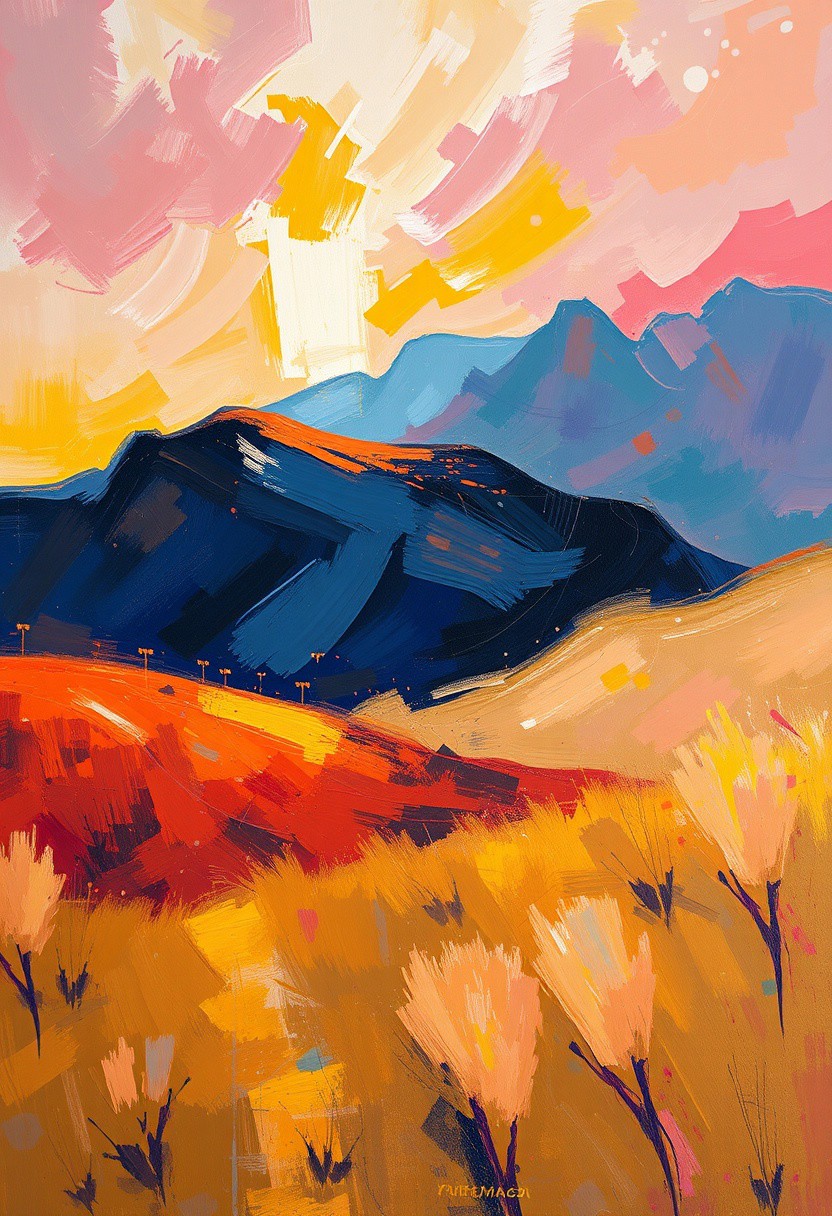 expressive Fauvist brushstrokes, soft dreamlike textures, surreal color blending, bold high-contrast landscapes, glowing poetic atmosphere, vibrant yet nostalgic composition, dynamic movement with gentle ethereal light