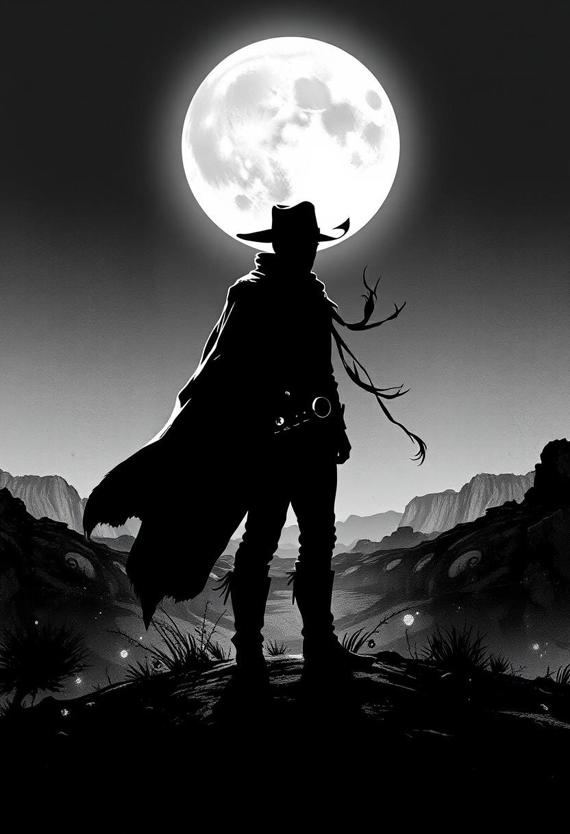 A lone cowboy standing under a full moon, his silhouette rendered in sharp black-and-white contrast, while his cloak and hat brim extend into swirling, ink-like flourishes. cinematic Western realism meets intricate illustration, high-contrast black-and-white elegance with rugged atmospheric textures, elongated stylized figures with deep dramatic lighting, ornamental flowing linework blending into dusty frontier landscapes, surreal yet storytelling-driven
