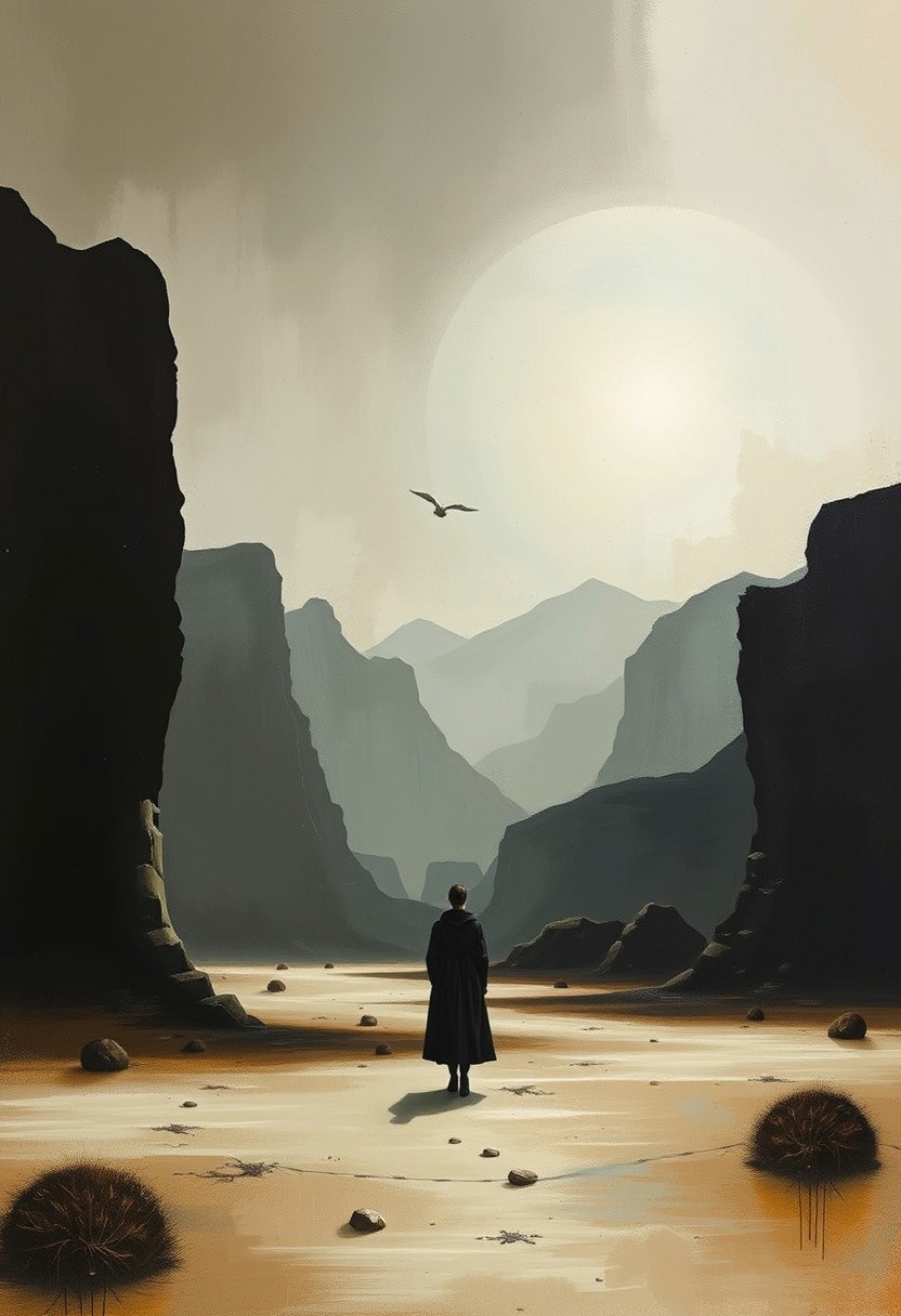 surreal minimalist figures in vast expressive landscapes, bold painterly textures blending into negative space illusions, muted earthy color palettes with luminous highlights, poetic storytelling meets conceptual mystery, haunting yet dreamlike atmosphere