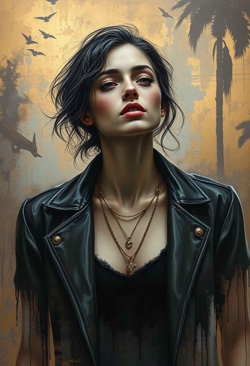 hyper-realistic street art with ethereal fine-art elegance, dramatic cinematic lighting with soft painterly textures, muted urban tones blending into rich gilded backgrounds, contemporary figures with classical melancholic expressions, gold leaf accents and surreal abstract elements