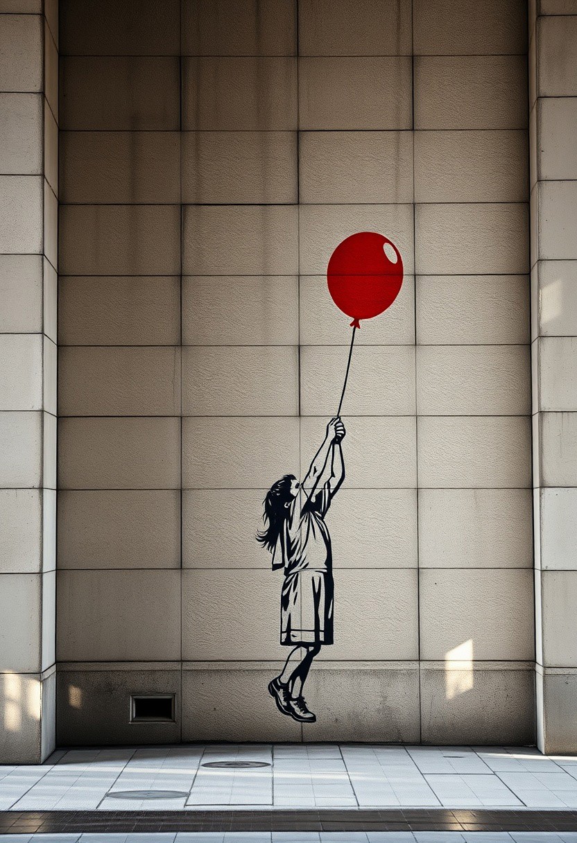 A large-scale street mural depicting a child holding a red balloon, but instead of a city wall, it is painted onto a minimalist, textured stone façade, making the scene feel both poetic and deeply impactful.minimalist brutalist architecture meets provocative stencil street art, raw concrete and stone textures blending with high-contrast political imagery, atmospheric lighting with conceptual urban intervention, muted neutral tones with striking visual contrast, introspective space meets rebellious social critique