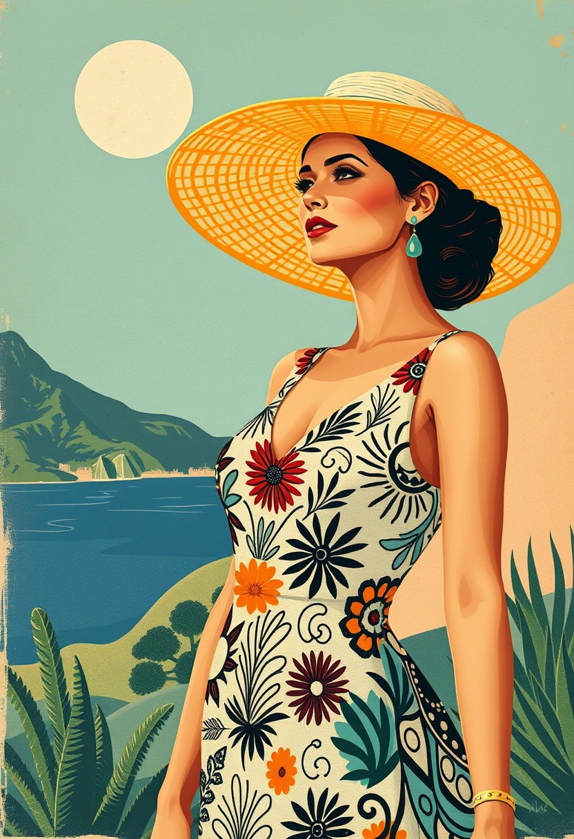 A retro tourism ad featuring a woman in a sun hat, her dress covered in dynamic, hand-drawn motifs, blending classic elegance with playful modern energy. vintage travel poster realism infused with bold textile-inspired abstraction, soft painterly textures blending with geometric rhythmic patterns, bright and playful color contrasts, classic Art Deco composition with dynamic organic shapes, nostalgic yet modern fusion of structured elegance and vibrant spontaneity