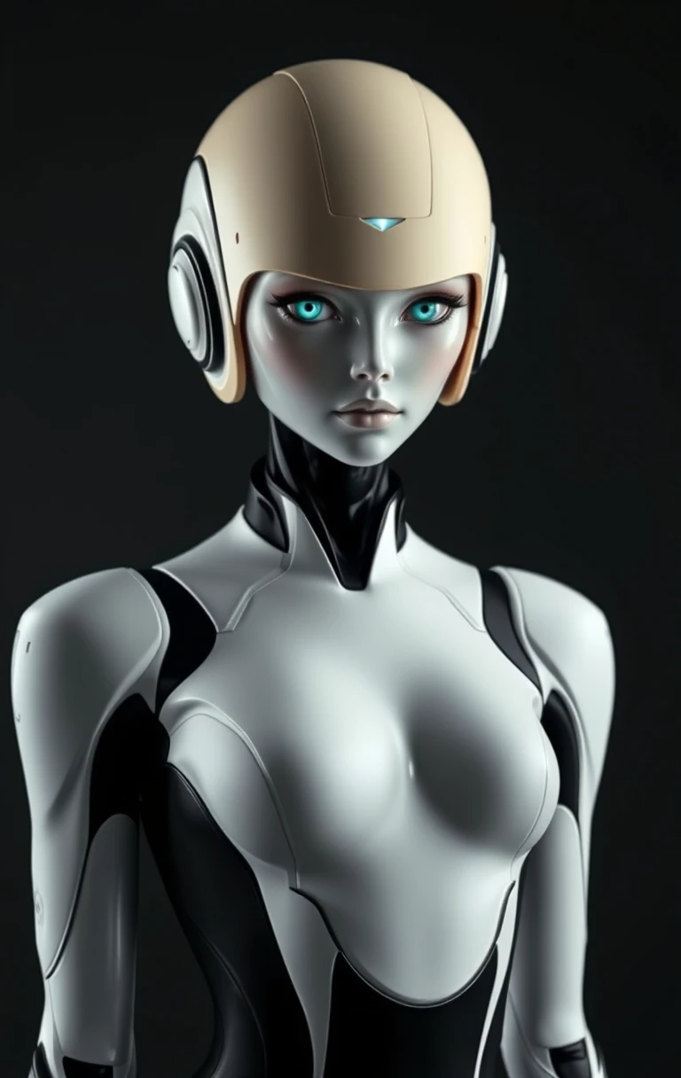 A hyperrealistic, full body shot of a futuristic, androgynous android woman. Monochromatic white and stark black design, the android's body is sculpted with smooth, flowing lines. The costume appears to be a tight-fitting suit with accents of black, emphasizing the curves of the body. The head is topped with a rounded, light beige/tan helmet-like structure. Large, teal eyes are prominent, and a small, glowing light or mark is on her forehead. Black shadows are present for dramatic contrast against the entire figure. The setting is a dark, studio backdrop that accentuates the figure, with a focus on form and shape. The overall impression is elegance, sophistication, and futuristic design.