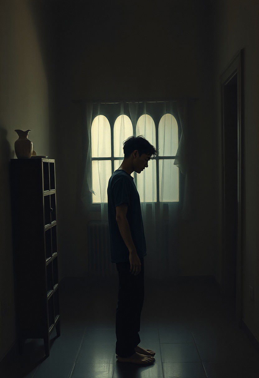 A moody, dimly lit interior where a solitary figure stares at an unseen object, their posture distorted slightly by expressionist brushstrokes, but the softness of the light evokes an almost photographic fragility.expressionist portraiture infused with soft melancholic photography, earthy muted colors blending with grainy black-and-white textures, exaggerated emotional features dissolving into quiet nostalgic shadows, raw painterly brushstrokes with intimate poetic lighting, introspective storytelling infused with quiet vulnerability