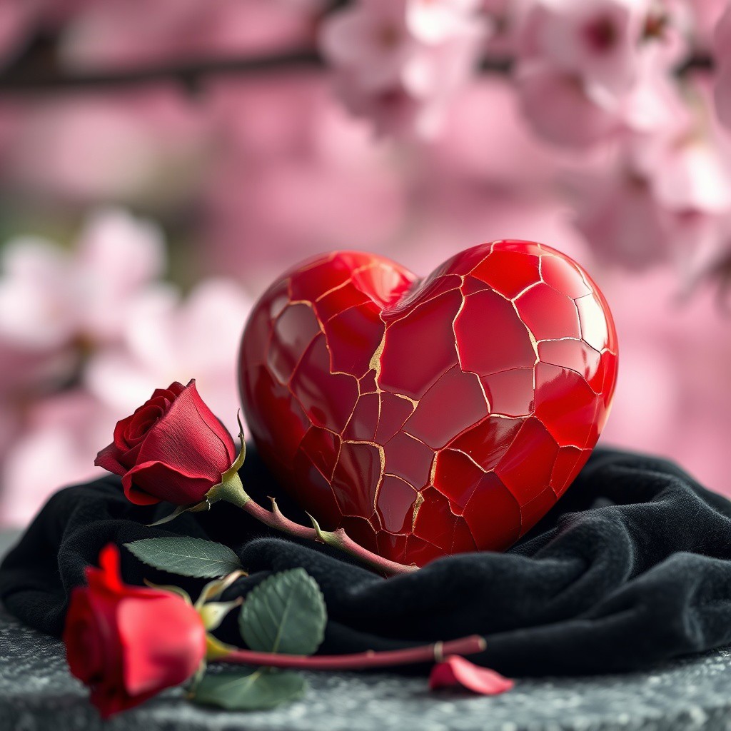 A red porcelain Valentine heart, red, glossy surface, repaired in the japanese kintsugi style, with gleaming gold visible in the numerous wide cracks ion its surface. the heart is nestled into a base of black velvet. In front of the heart is a single long-stem red rose with thorns on the stem. The background is a cherry blossom garden blurred into a soft pastel bokeh.