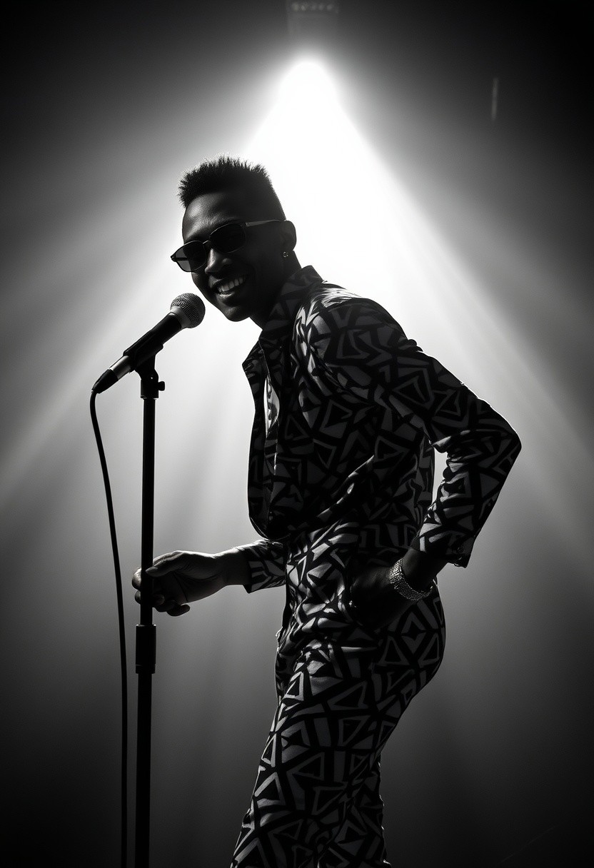 A sharply lit, high-contrast portrait of a musician in a bold patterned outfit, their silhouette sculpted with sleek rendering, but their pose and expression capturing the candid joy of a photograph. high-contrast cinematic lighting blending with spontaneous documentary portraiture, dynamic stylized figures with expressive realism, bold graphic compositions infused with geometric patterned backdrops, raw yet elegant storytelling, deep black-and-white contrasts with painterly texture