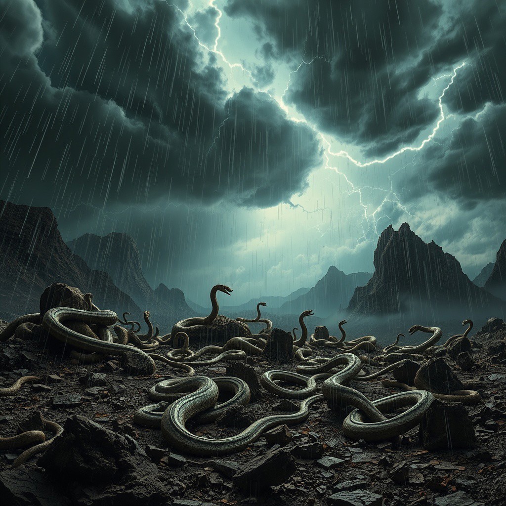 A rain of snakes of all kinds over a blasted rocky landscape. The scene is surreal and ominous with dramatic lighting from lightening blots from the roiling clouds.