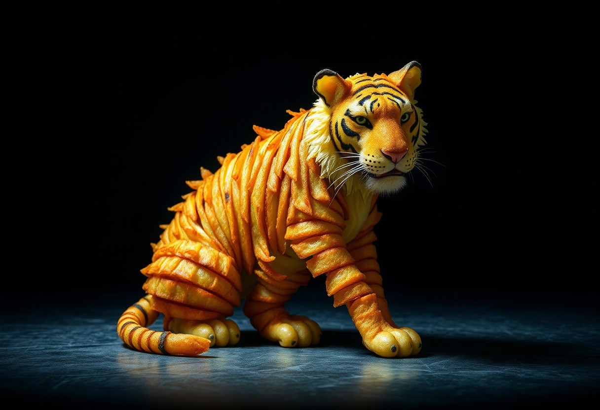 tigre formado por patatas fritas, colores vibrantes, aspecto tranquilo, fondo oscuro, primer plano, iluminacion derecha, cuerpo de patatas, cortadas, rodajas, sentado mirando a la camara, fotografia cinematografica.