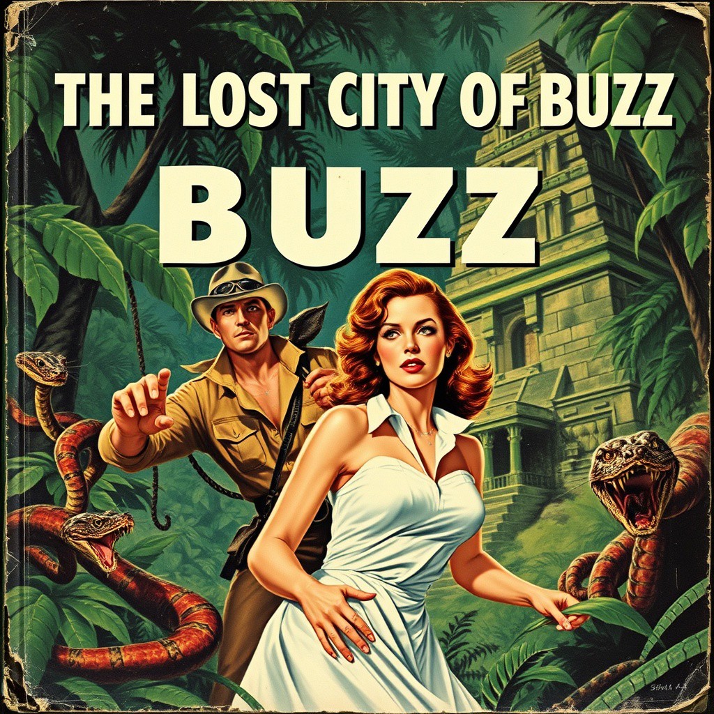Pulp Paperback book cover, A dynamic and dramatic cover for an adventure pulp magazine, the title "THE LOST CITY OF BUZZ" featuring two explorers discovering a mysterious, snake infested, jungle covered ruined Mayan city. One of the explorers is a handsome, rugged Man in a battered fedora while the other is a beautiful woman in a high collar white dress with improbably perfect makeup and hair. The composition of the scene and jungle background emphasize the drama and sense of perilous adventure. vintage pulp cover, faded colors, worn edges, creased,retro illustration style, scuffed and weathered look, printed in mid-century design, signs of aging and heavy use, nostalgic and well-loved aesthetic. <lora:aidmaHyperrealism-FLUX-V0.1:0.8> <lora:Pulp_Cover_Art:0.9> <lora:retrofuturism_flux_lora_martintomov_v1:0.5>