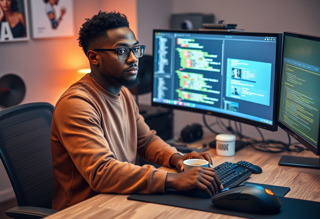 A picture of a light-skinned African Tech guy sitting in front of a desk with large computer monitor sectioned into 4 places with programming on the screen and a cup of coffee on the table, with a beautiful computer mouse and a mechanical keyboard, hyper-realistic 4K